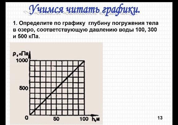 Каждое деление на вертикальной оси - это 100кПа, а каждое деление на горизонтальной оси - 10 метров.