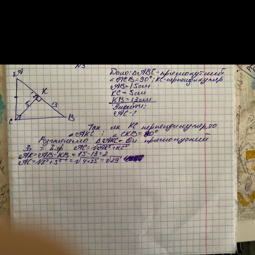 знайдіть довжину катета АС, якщо АВ=15см, КС=5см, КВ=13см.