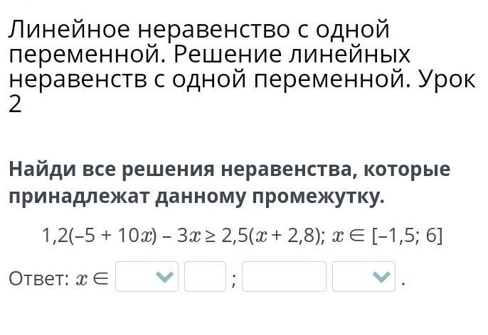Урок 2 Найди все решения неравенства, которые принадлежат данному промежутку. 1,2(–5 + 10x) – 3x ≥ 2,5(x + 2,8); x ∈ [–1,5; 6] Ответ: x ∈ ; .