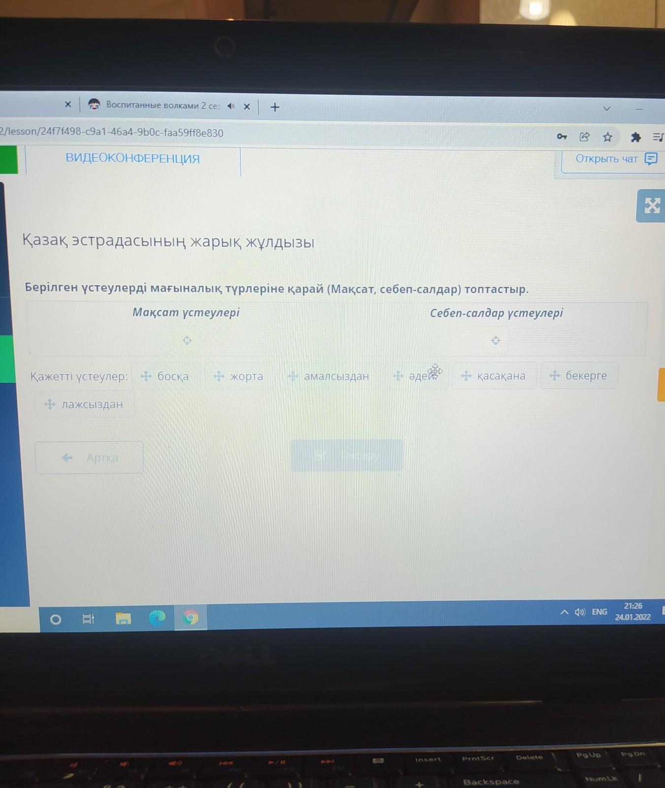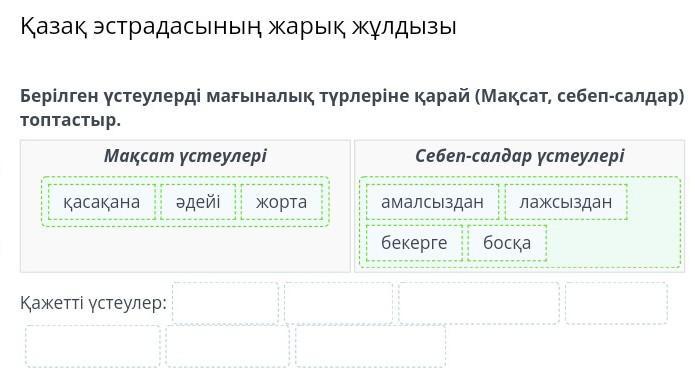 Берілген үстеулерді мағыналық түрлеріне қарай (Мақсат, себеп-салдар) топтастыр. Мақсат үстеулері Себеп-салдар үстеулері Қажетті үстеулер: босқа орта амалсыздан А одейі - қасақана • бекерге 1 лажсыздан