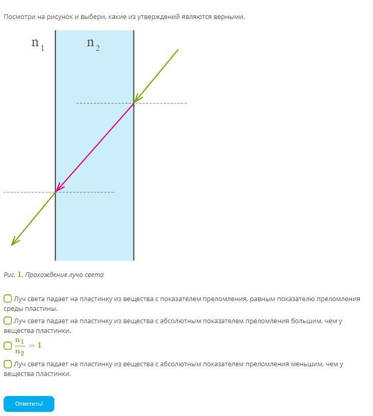 Показатели преломления равны, луч не меняет направления распространения.