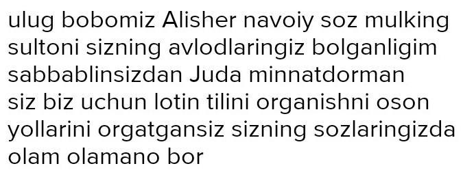 ulug bobomiz Alisher navoiy soz mulking sultoni sizning avlodlaringiz bolganligim sabbablinsizdan Juda minnatdorman siz biz un lotin tilini organishni oson yollarini orgatgansiz sizning sozlaringizda olam olam Mano bor