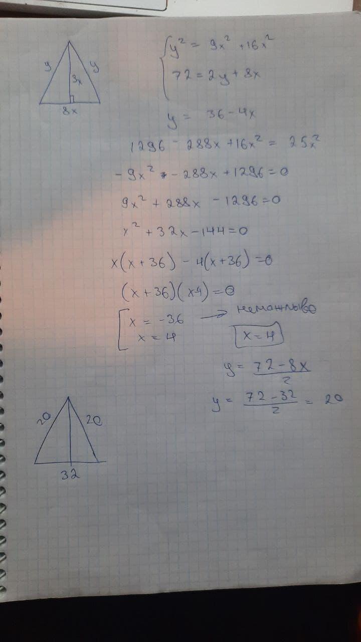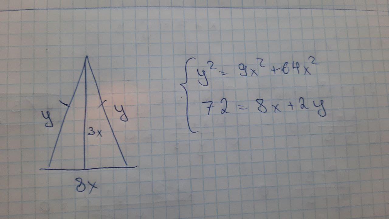 основа рівнобедреного трникутника відноситься до проведеної до нього висоти як 8:3. Знайдіть сторони трикутника, якщо його периметр= 72 см