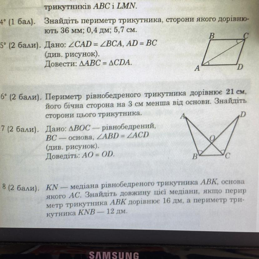 AOB = DOC, так как они оба смежны с BOC. Получаем, что треугольник AOB равен треугольнику DOC по сторону и двум прилежащим углам. Раз треугольники равны, то и соответствующие стороны тоже равны. Отсюда АО = ОД