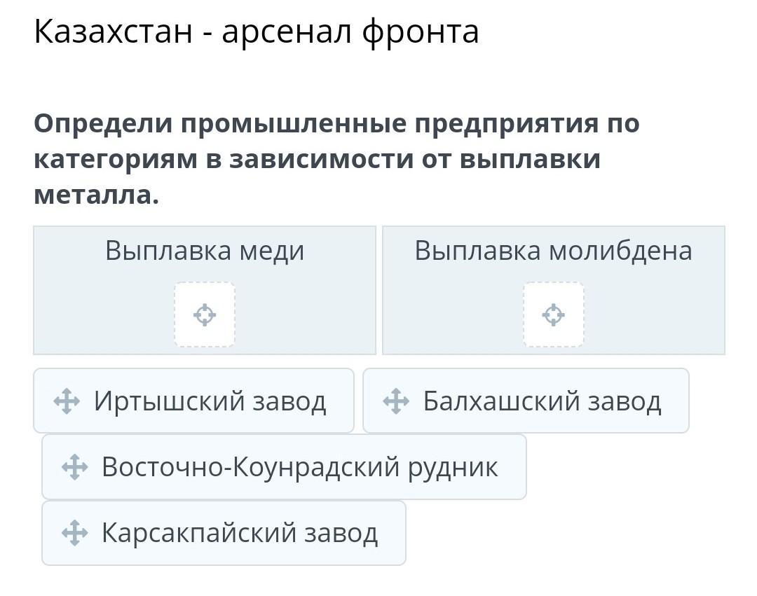 Казахстан - арсенал фронта Определи промышленные предприятия по категориям в зависимости от выплавки металла.
