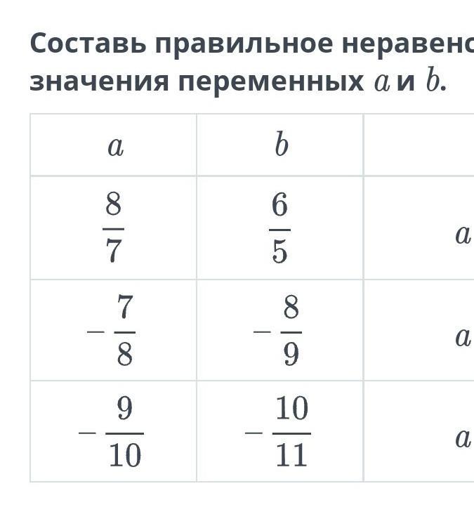 Числовые неравенства и их свойства. Урок 1 Составь правильное неравенство, подставив значения переменных a и b.