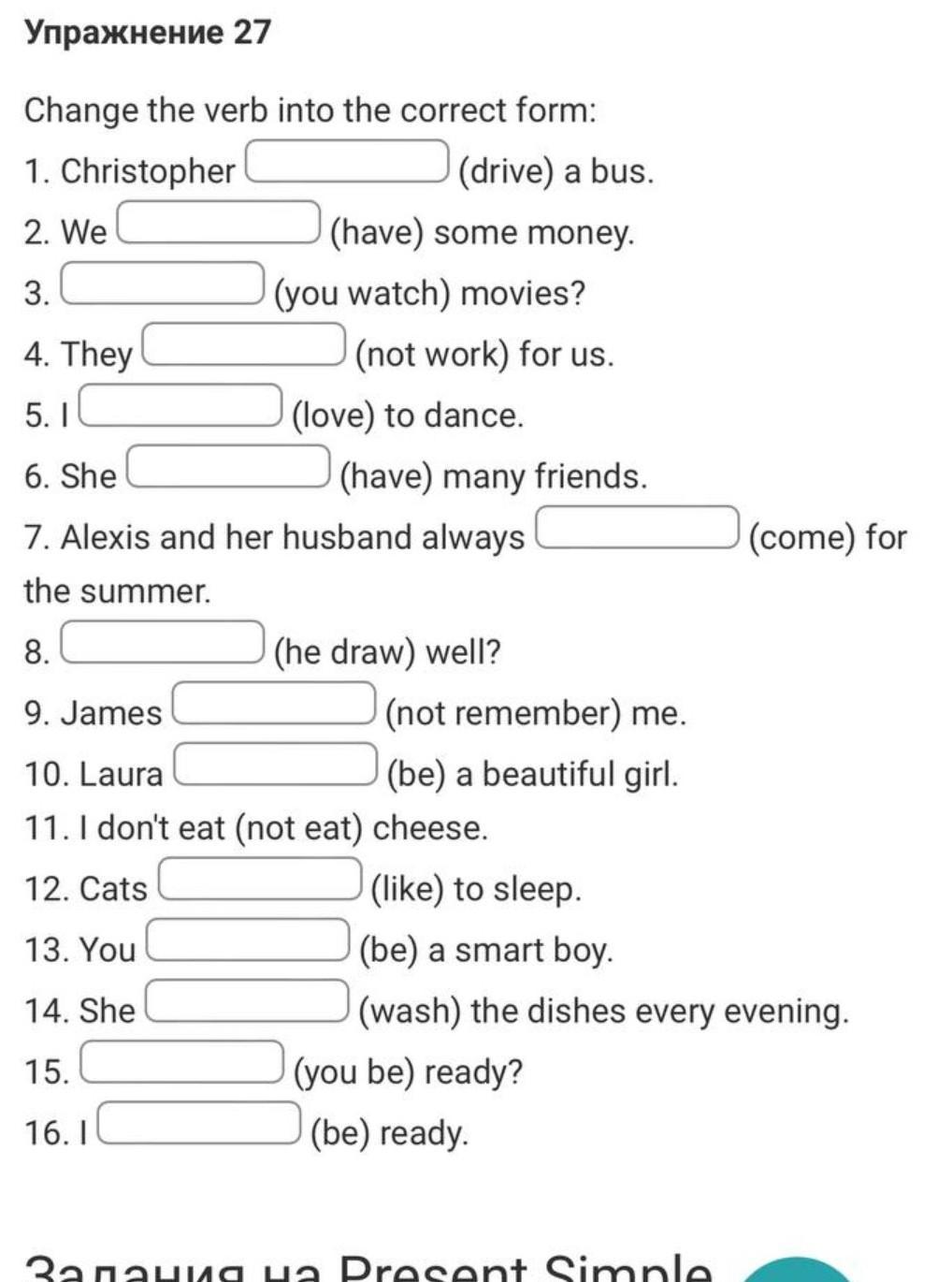 1 drives 2 have 3 do you watch 4 don't work 5 love 6 has 7 come 8 does he draw 9 doesn't remember 10 is 11 don't eat 12 like 13 are