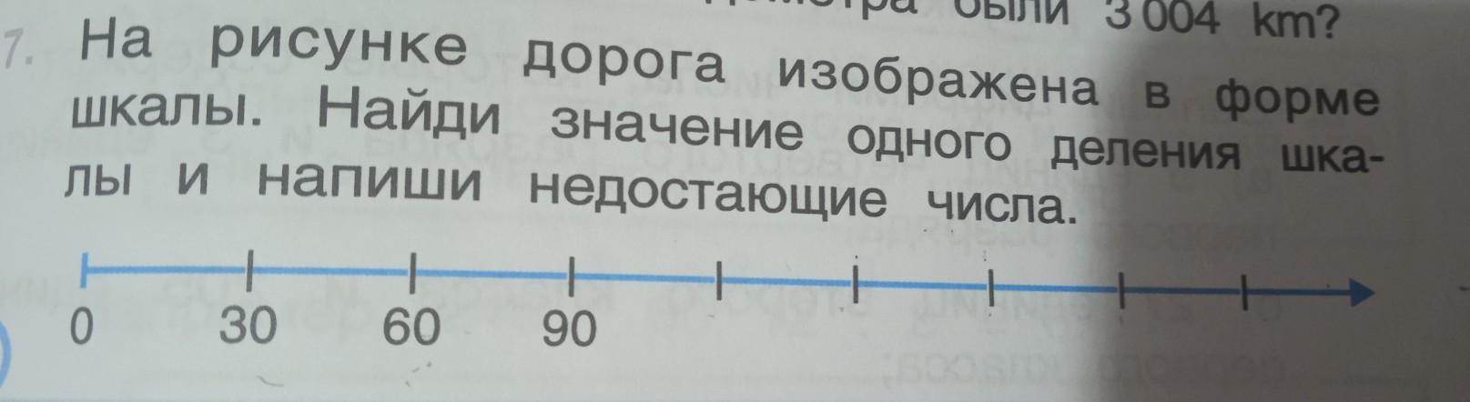 На рисунке дорога изображена в форме шқалы. Найди значение одного деления шка- пы и напиши недостающие числа. -Н - — о 30 60 90