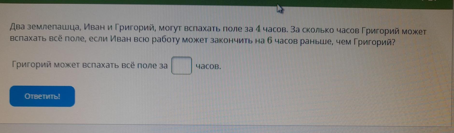 пусть Григорий выполнит всю работу за х ч., тогда Иван за (х-6), если всю работу принять за 1, то 1/х- производительность Григория, а 1/(х-6) - производительность Ивана, составим и решим уравнение.