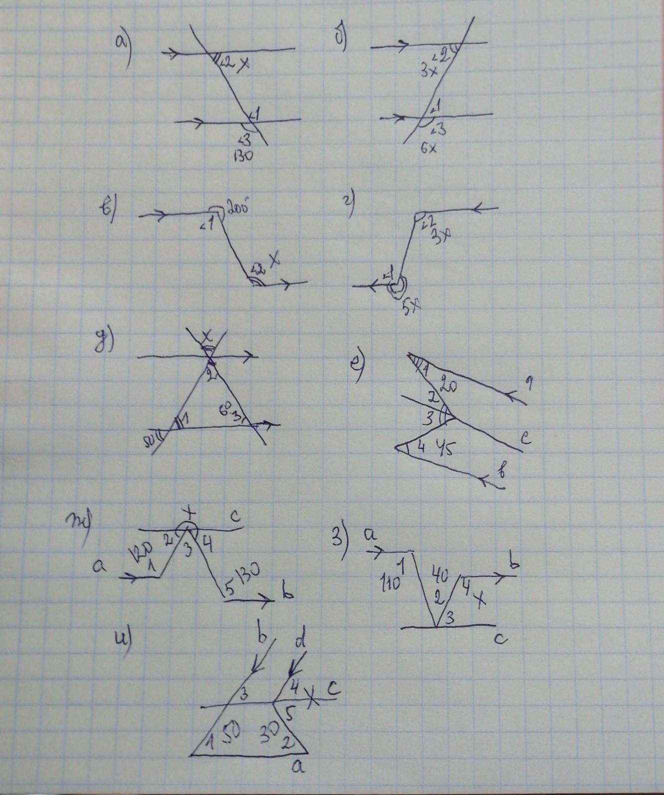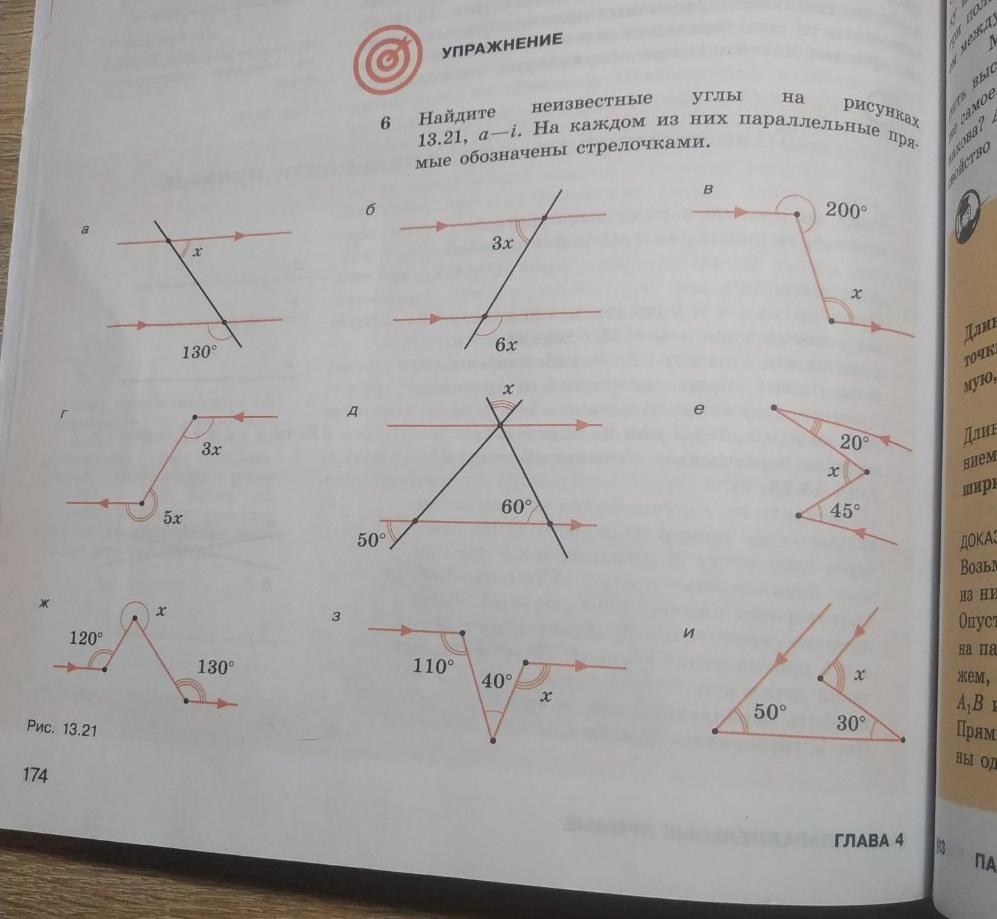 найдите неизвестные углы на рисунке 13.21 на каждом из них параллельные прямые обозначены стрелочками