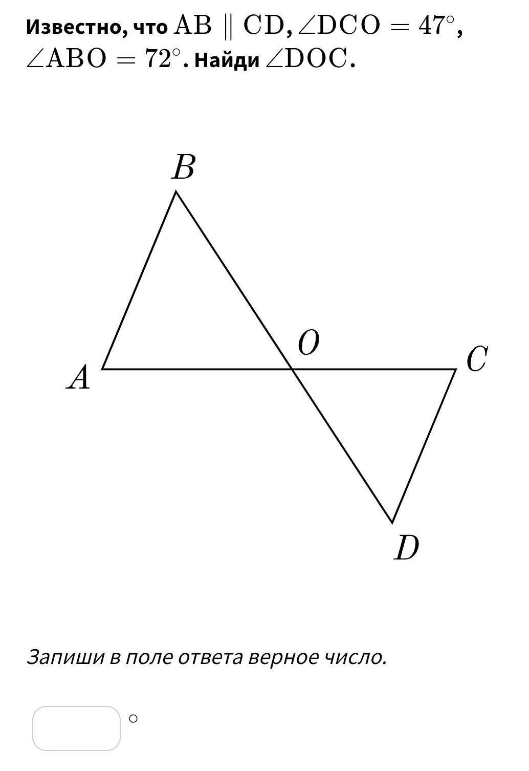Угол DCO=ABO, как внешне накрест лежащий. Так как сумма углов одного треугольника равно 180°, то нужно 180-(72+47), получится 61. Ответ: 61°.