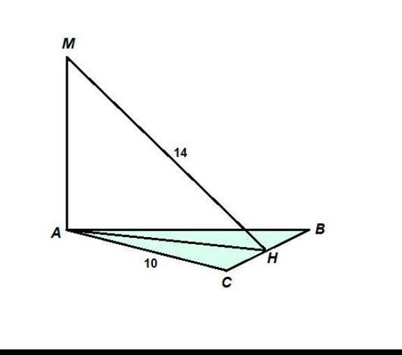 \boldsymbol{MA}=\sqrt{MH^2-AH^2}=\sqrt{14^2-(5\sqrt{3})^2}=\sqrt{196-75}=\sqrt{121}=\boldsymbol{11}MA=MH2−AH2=142−(53)2=196−75=121=11