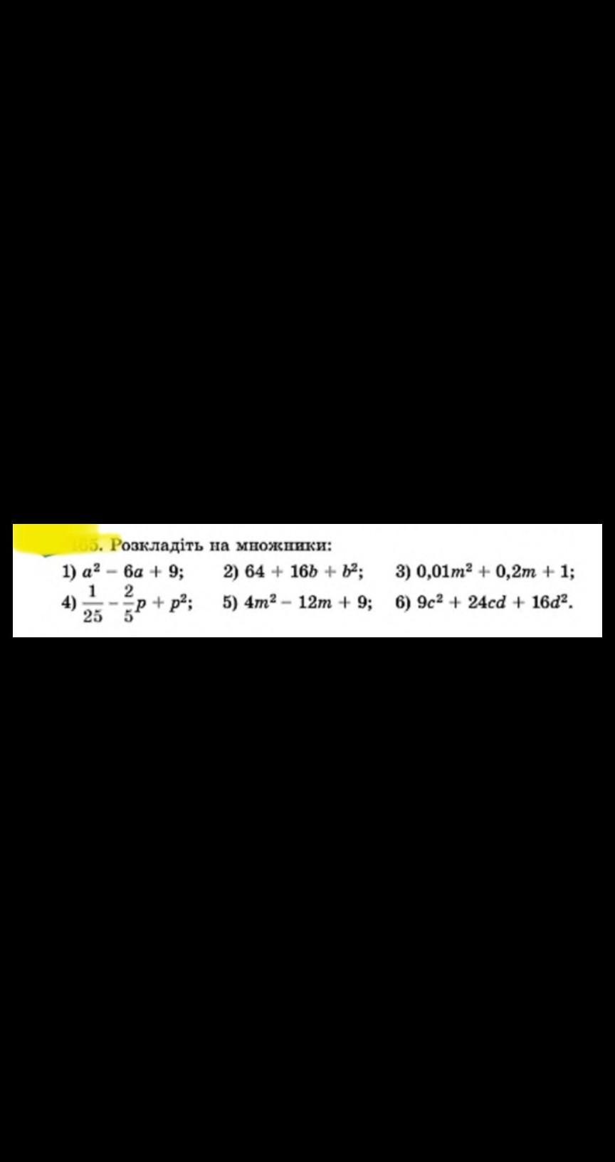 1) (a-3)² 2) (8+b)² 3) (0,1m+1)² 4) (1/5-p)² 5) (2m-3)² 6) (3c+4d)²