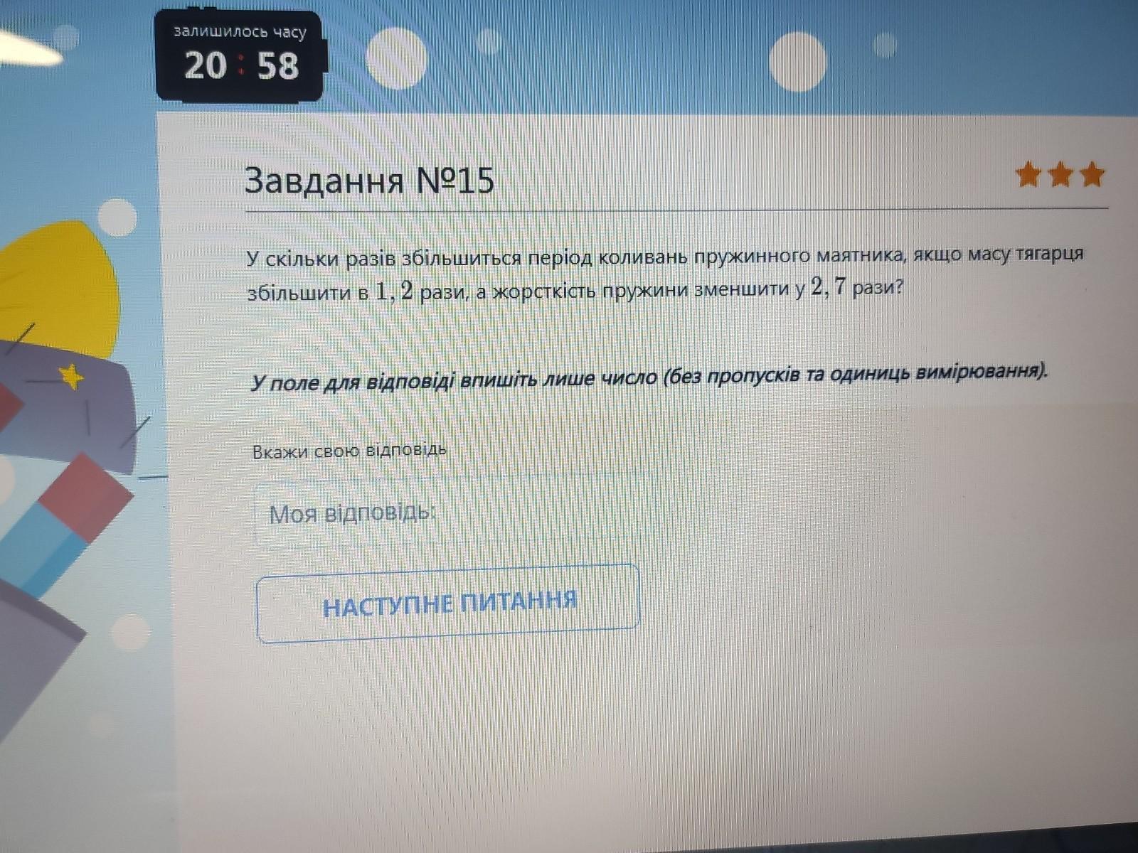 У скільки разів збільшиться період коливань пружинного маятника, якщо масу тягарця збільшити в 1,2 рази, а жорсткість пружини зменшити у 2, 7 рази?