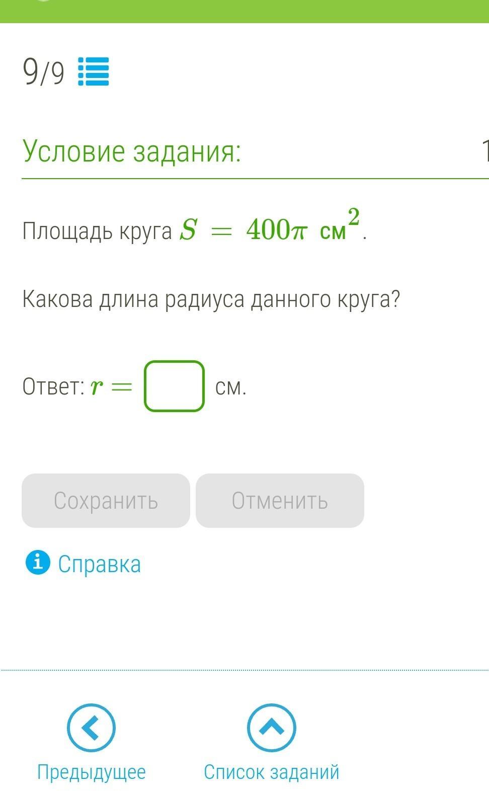 Площадь круга равна:S = πR² отсюда найдем радиус