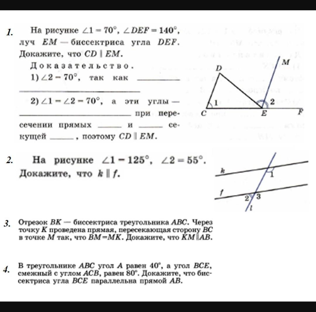 1) Угол 1 = 70 градусов, так как угол DEF = 140 градусов. А лум EM является биссектрисой угла DEF. Биссектриса делит угол пополам => 140:2=70.