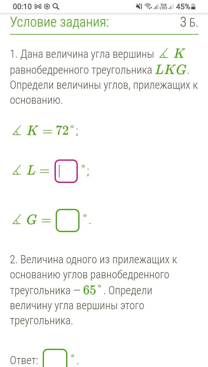 108°:2= 54°, ведь у равнобедренного треугольника углы, прилежащие к основанию равны