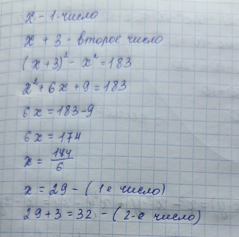 решите задачу с помощью составления системы уравнений разность двух чисел равна 3, а разность их квадратов 183. Найдите эти числа