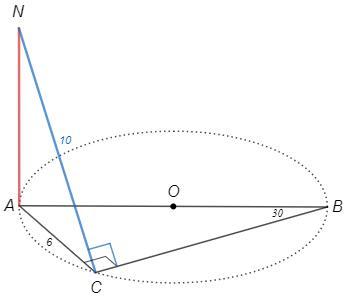 Дана окружность с центром в точке О и радиусом 6. Отрезок AB - диаметр окружности, а отрезок BC - хорда. Угол ABC равен 30 градусов. Отрезок АN перпендикуляр к плоскости окружности. Найди расстояние от точки N до плоскости окружности, если расстояние от точки N до прямой BC равно 10