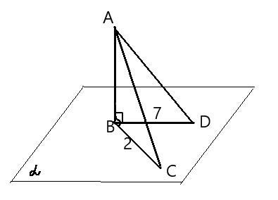 Прямая AB перпендикулярна прямым BD и BC, принадлежащим плоскости α. Найдите длину наклонной AC, если AD + AC = 15, BD = 7, BC = 2.