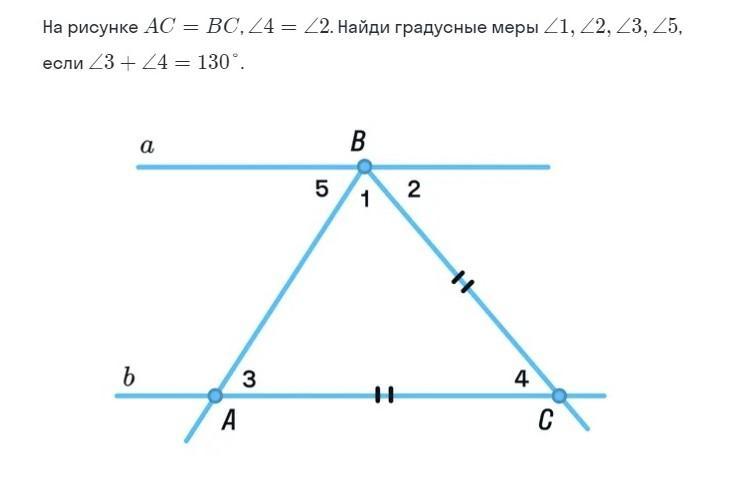 А можно и так: углы 2 и 4 равны, а они накрест лежащие при прямых а и b и секущей ВС, значит прямые а и b параллельны. Тогда равны и углы 3 и 5 - накрест лежащие при этих же прямых и секущей АВ. Так как углы 3 + 4 равны 130°, то и сумма углов 5 и 2 тоже равна 130°. Углы 5, 1 и 2 составляют развернутый угол, значит угол 1 равен 180 - 130 = 50°. Далее все понятно.