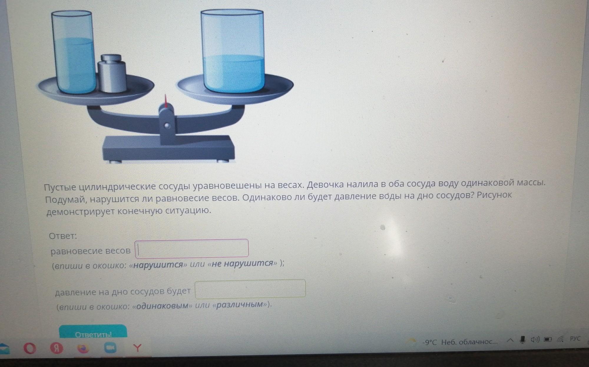 Пустые цилиндрические сосуды уравновешены на весах. Девочка налила в оба сосуда воду одинаковой массы. Подумай нарушится ли равновесие весов. Одинаково ли будет давление воды на дно сосудов? Рисунок демонстрирует ситуацию.