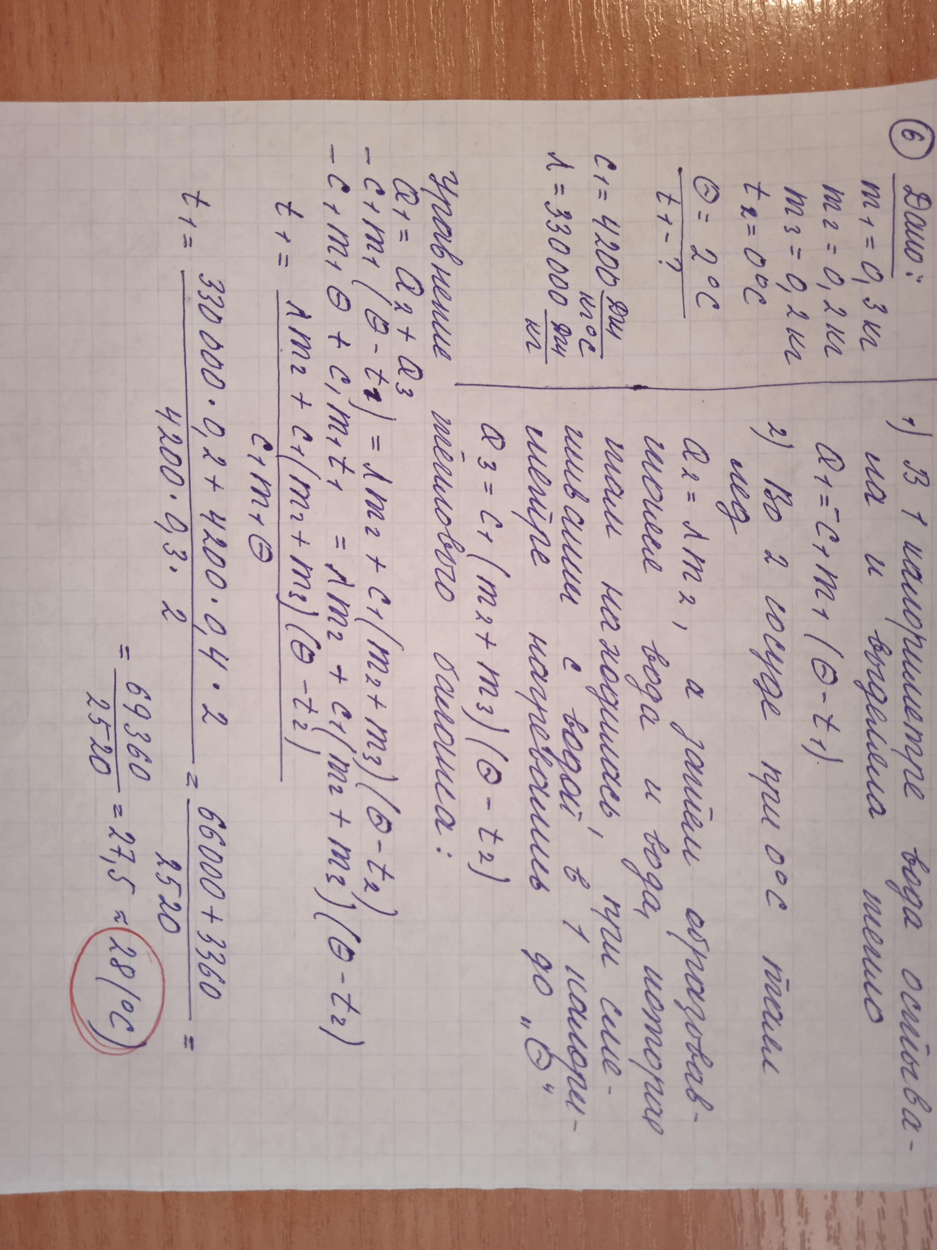 6)В школьном физическом кружке изучали уравнение теплового баланса. В одном из опытов использовали два калориметра. В первом калориметре находилось 300 г воды, во втором — 200 г льда и 200 г воды при 0°С. Какой была первоначальная температура воды в первом калориметре, если после добавления в него всего содержимого второго, в первом калориметре установилась температура 2°C? Теплоёмкостью калориметров пренебречь. Ответ дайте в градусах Цельсия и округлите до целых.