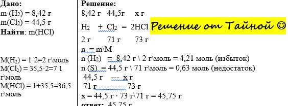 Какая масса соляной кислоты образуется при взаимоднйствии 44,5 грамм хлора с 8,42 граммами водорода?