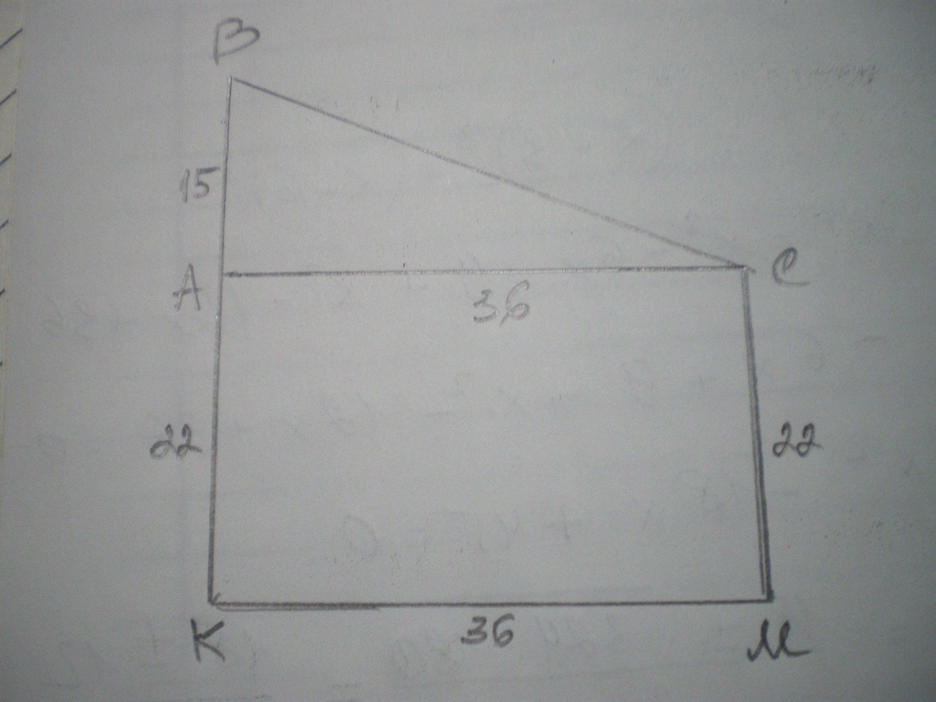 Дано: КВ=37 м, АС=КМ=36 м, АК=СМ=22 м, АВ=КВ-АК=15 м.