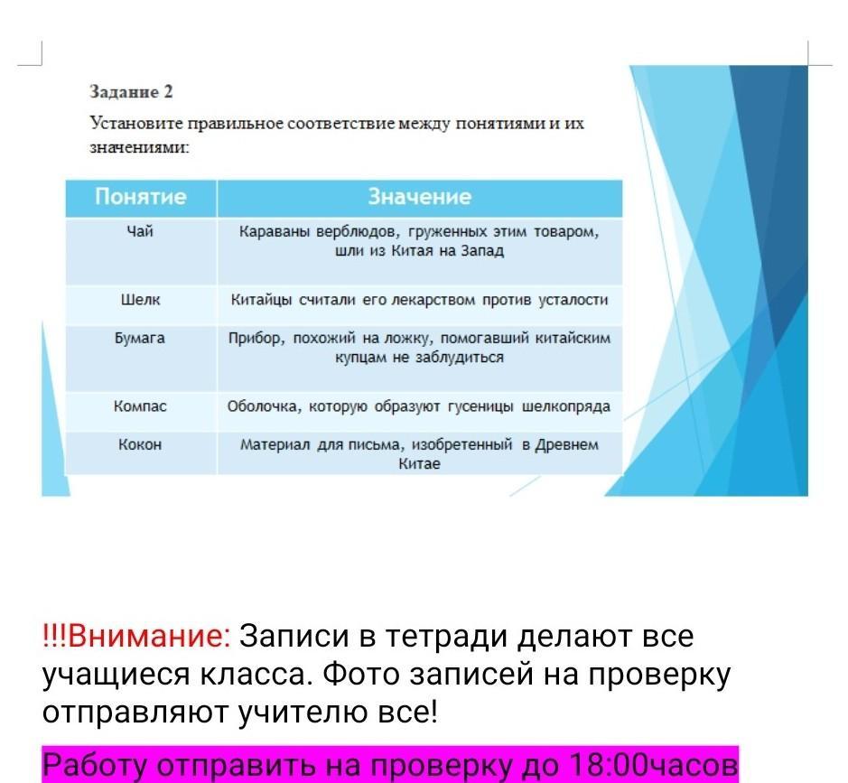 Установите правильное соответствие между понятиями и их начениями Задание 2 Понятие чай Значение Караваны верблюдоо, груженных этим товаром. шли на Китая на запад Шелк Бумага Китайцы считали его мекарством против усталости Прибор, похожий на ложку, помогавший китайским купцам не заблудиться Компас Кокон оболочка, которую образуют гусеницы шелкопряда Материал для письма, изобретенный в Древнем Китае