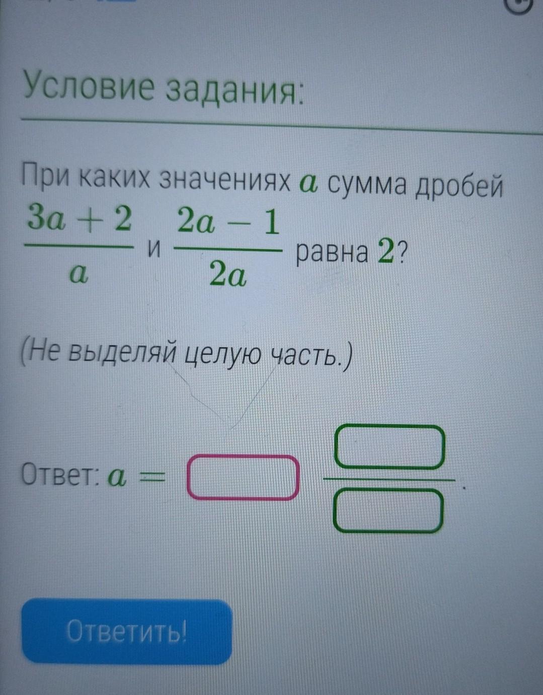 При каких значениях а сумма дробей За + 2 2а - 1 1 И равна 2? a 2а (Не выделяй целую часть.) Ответ: ????