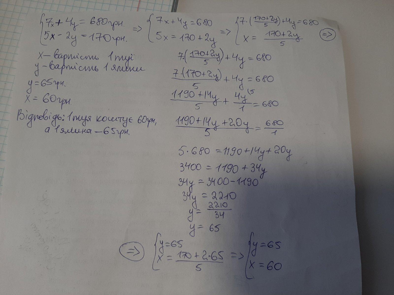 Для озеленення території школа закупила 7туй та 4 ялини. Разом заплатили 680грн. Скільки коштує туя та ялина, якщо 5 туй дорожчі за 2 ялини на 170грн.