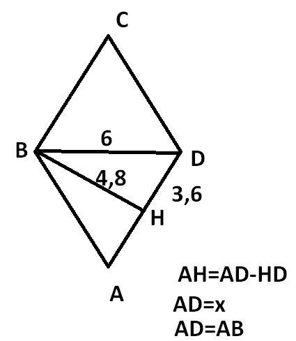 Возьмём AD=x; HD=√6²-4,8²=√36-23,04=√12,96=3,6