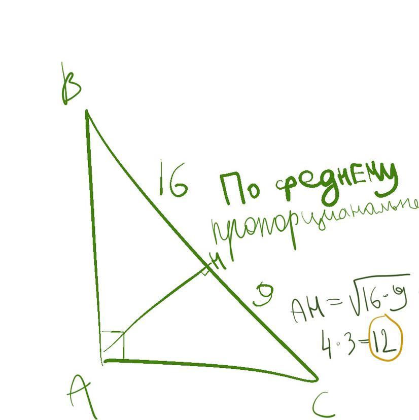 в прямоугольном треугольнике ABC с прямым углом c проведена высота из вершины прямого угла к гипотенузе. Найдите высоту, если она делит гипотенузу на отрезки равные 16 и 9см
