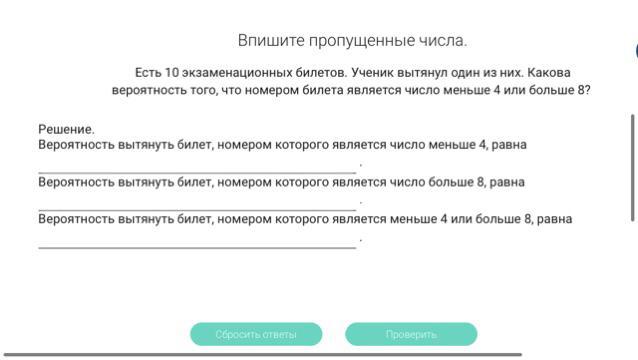 Есть 10 экзаменационных билетов. Ученик вытянул один из них. Какова вероятность того, что номером билета является число меньше 4 или больше 8?