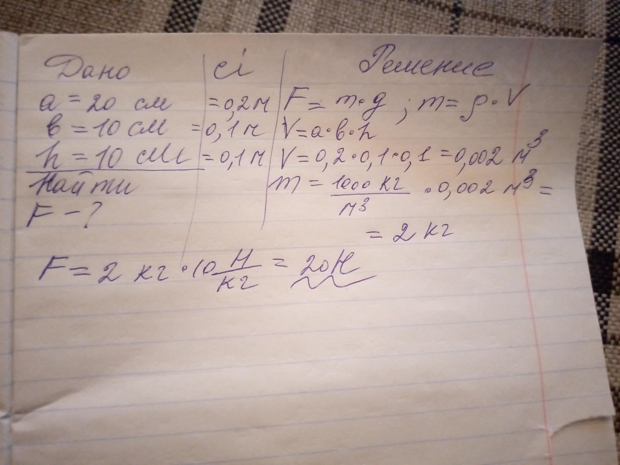 .С какой силой вода действует на дно сосуда длиной 20 см, шириной 10 см, высотой 10см?
