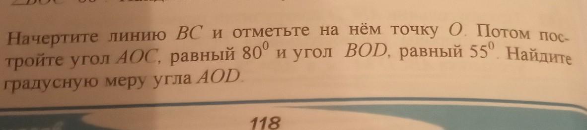 0. Начертите линию ВС и отметьте на нём точку О. Потом пос- тройте угол АОС, равный 80° и угол BOD, равный 550 Найдите градусную меру угла AOD. о