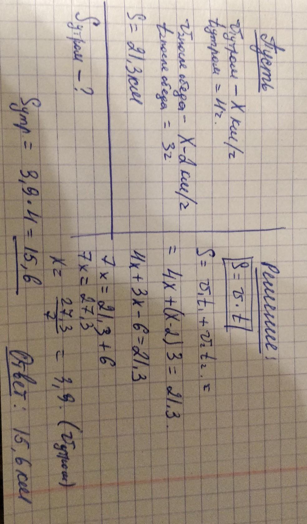 Экскурсанты за день прошли21, 3 км. С утра лни шли 4 часа, а после обеда еще 3 часа. Сколько км экскурсанты прошли утром, если после обеда их скорость снизилась на 2 км/ч. С какой скоростью шли экскурсанты утром