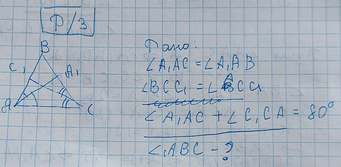 Но ∠ACB = 2*∠C1CA и ∠BAC = 2*∠A1AC (п. 1) => 2*∠C1CA + 2*∠A1AC = ∠ACB + ∠BAC = 160°