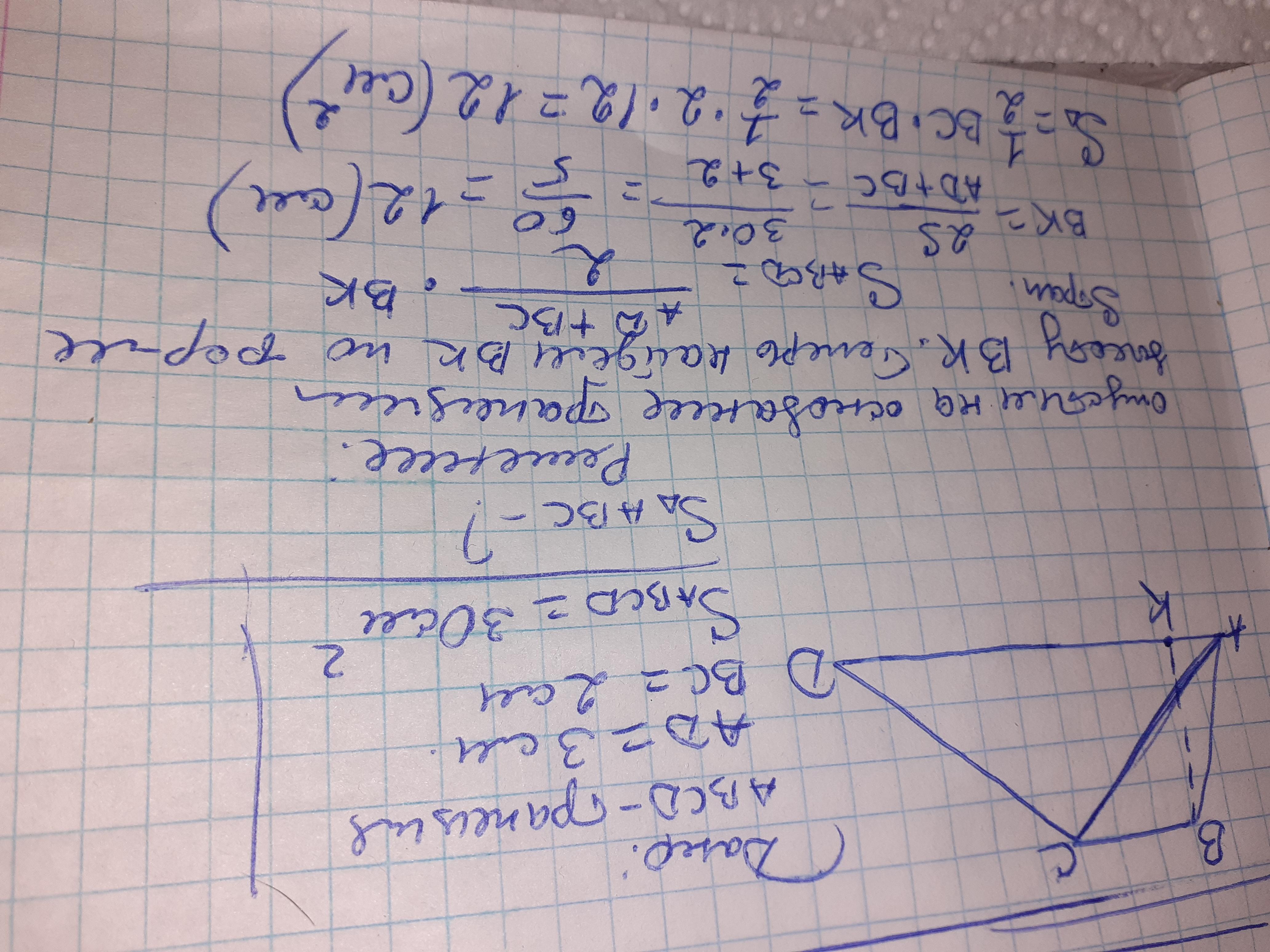 В трапеции авсд известно что ад 3 вс 2 а её площадь равна 30 найдите площадь треугольника авс