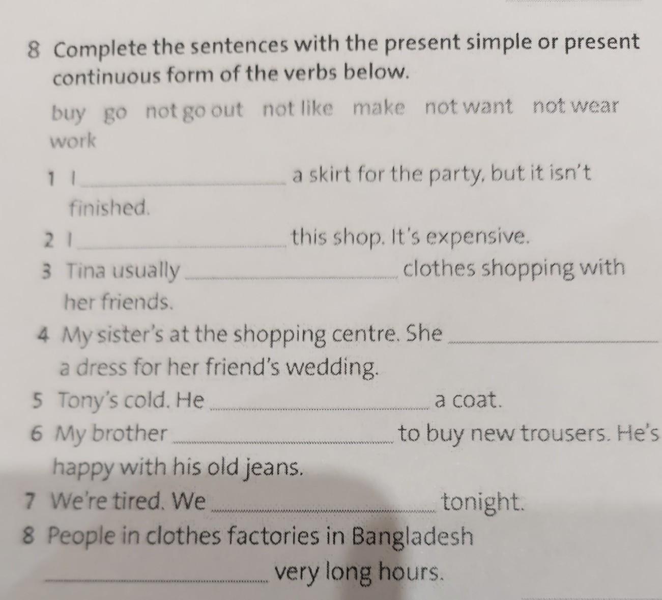 8 Complete the sentences with the present simple or present continuous form of the verbs below. . buy go not go out not like make not want not wear work 11 a skirt for the party, but it isn't finished 21 this shop. It's expensive. 3 Tina usually clothes shopping with her friends. 4 My sister's at the shopping centre. She a dress for her friend's wedding. 5 Tony's cold. He a coat. 6 My brother to buy new trousers. He's happy with his old jeans. 7 We're tired. We tonight 8 People in clothes factories in Bangladesh very long hours.