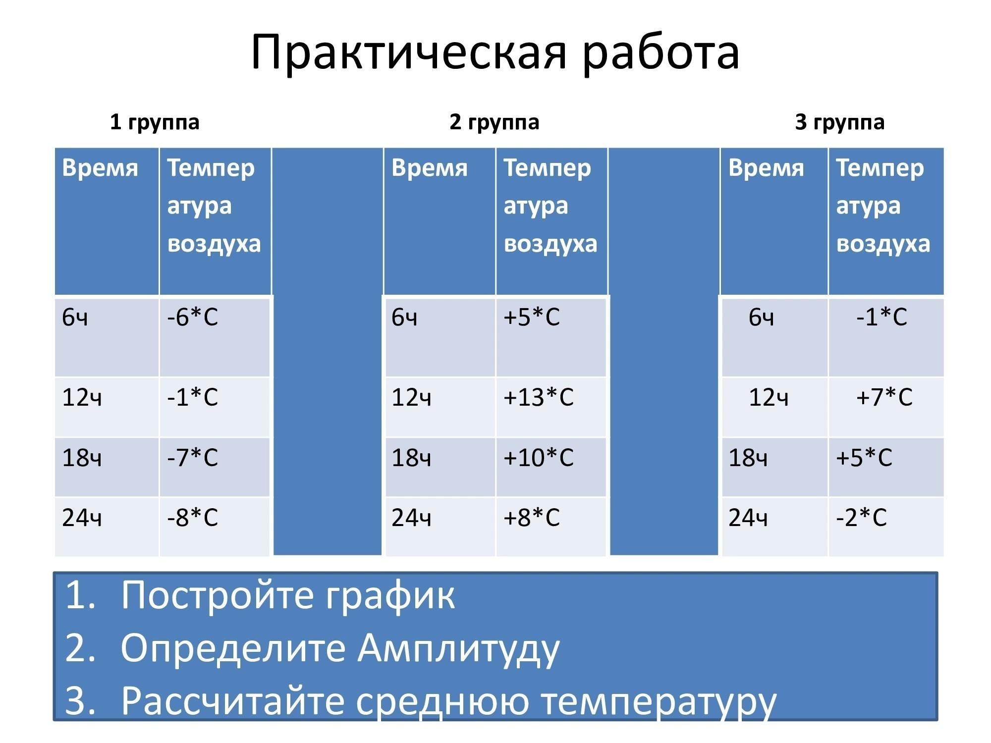 Амплитуда: чтобы посчитать амплитуду, нужно из самой высокой температуры вычесть самую низкую.