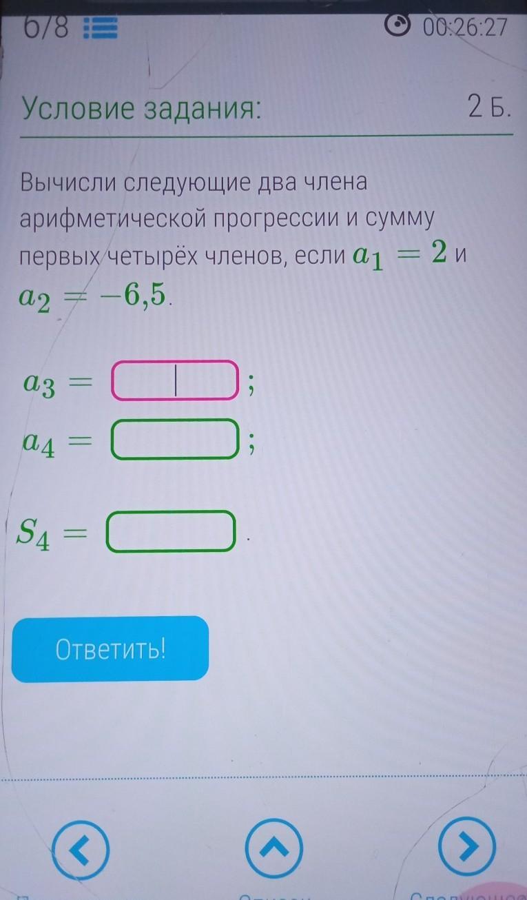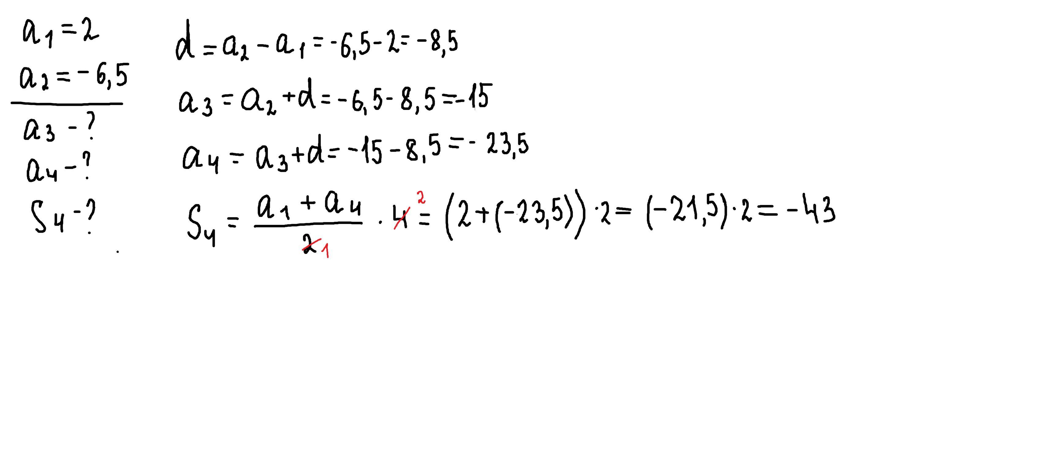 Вычисли следующие два члена арифметической прогрессии и сумму первых 4 членов если A1 = 2 и А2 =- 6,5