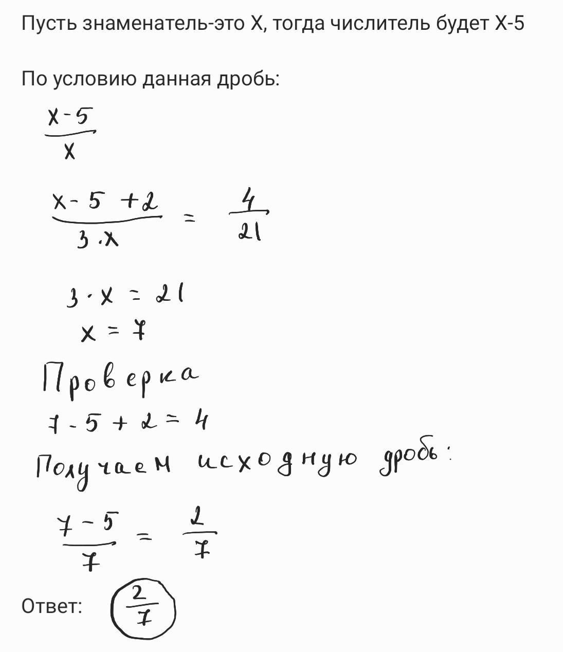 По данным решения, знаменатель получившейся дроби разделим на 3, числитель уменьшим на 2 => исходная дробь равна 2/7.