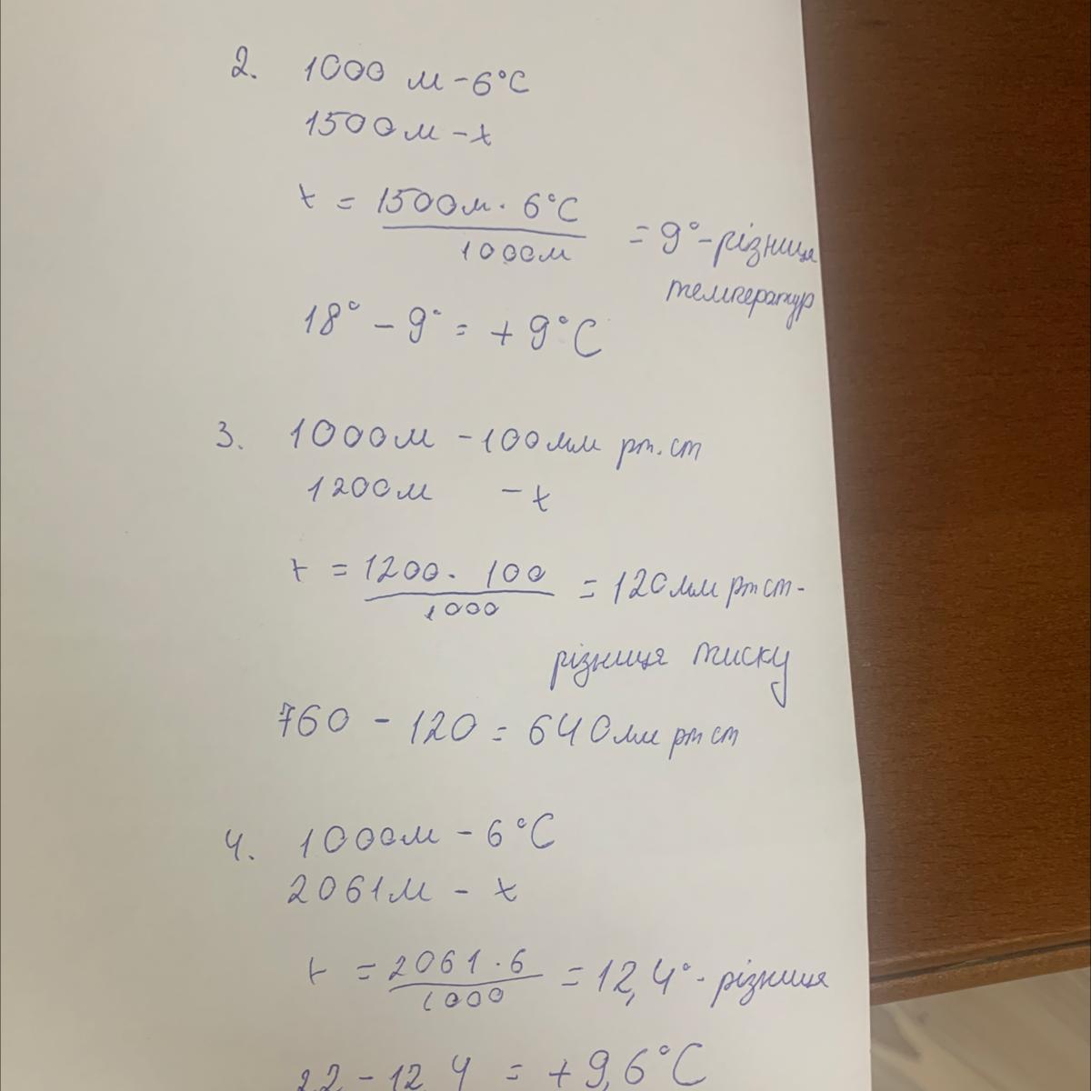 2. Визначте температуру повітря на висоті 1500 м, якщо на рівні моря вона становить +18С. Запишіть свої розрахунки і відповідь.