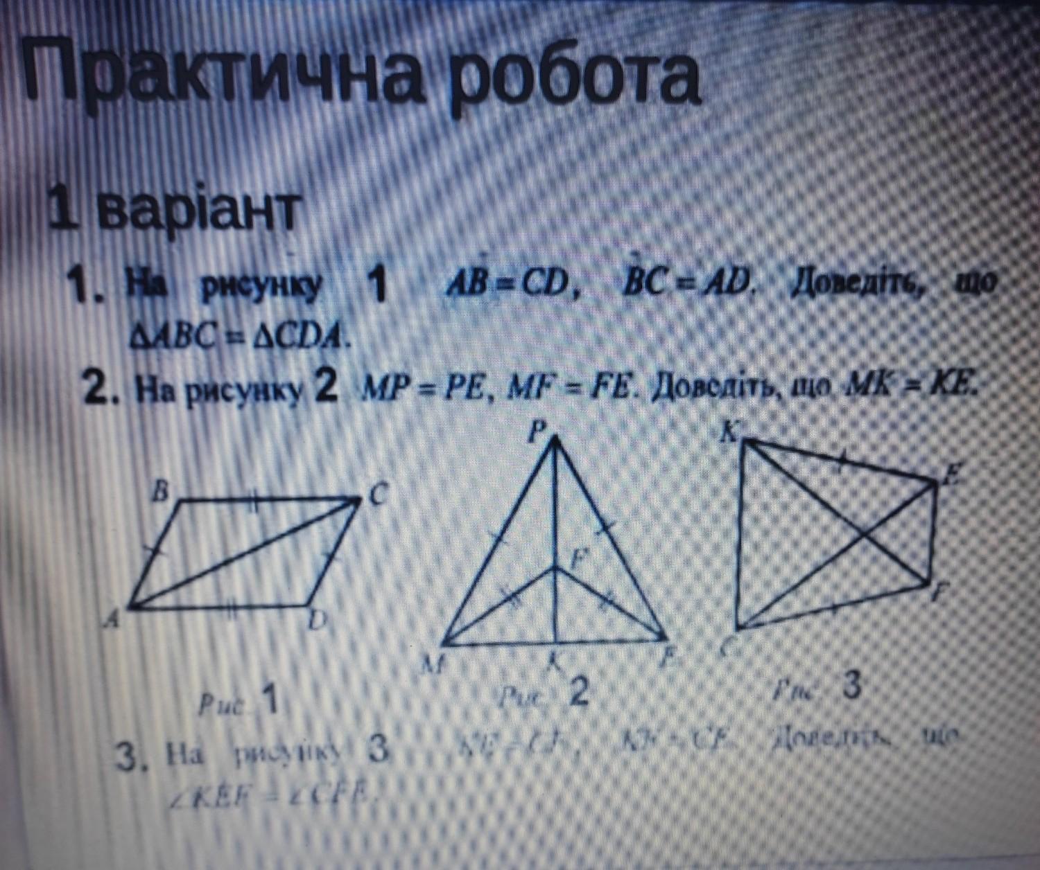 1. На рисунку 1 AB=CD, BC=AD. Доведіть, що трикутник ABC=трикутник CDA.