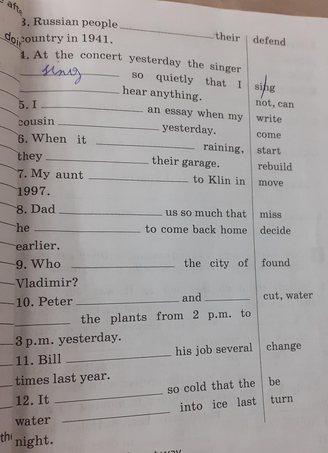 was singing, couldn't, was writing, came, started, rebuilded, moved, missed, decided, found, was cutting, was watering, changed, was, turnedturned