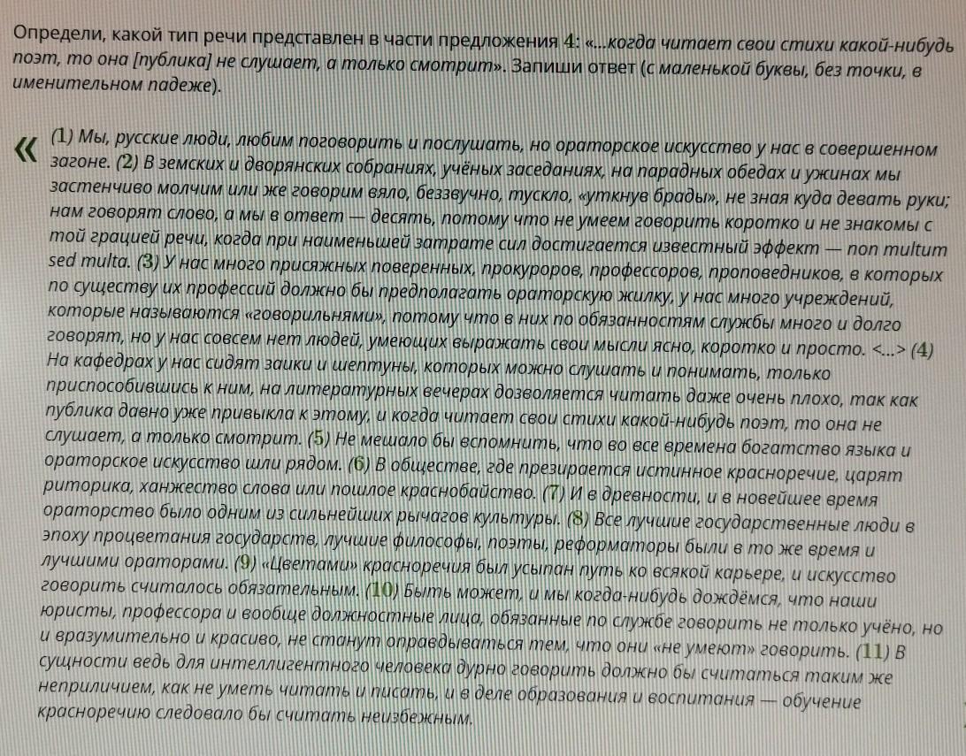 Определи, какой тип речи представлен в части предложения 4: «...когда читает свои стихи какой-нибудь поэт, то она (публика] не слушает, а только смотрит». Запиши ответ (с маленькой буквы, без точки, в именительном падеже).