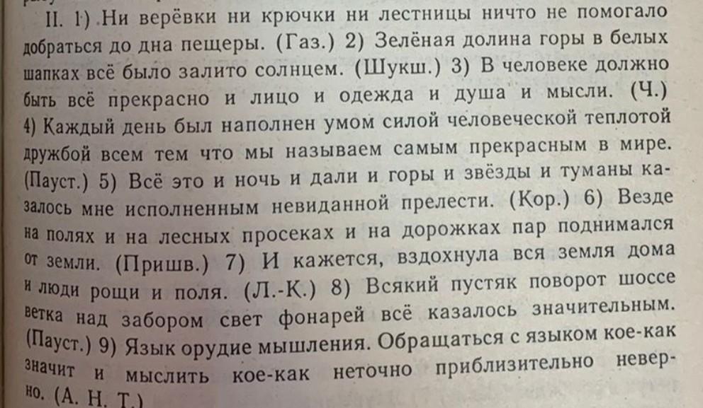II. 1) .Ни верёвки, ни крючки, ни лестницы- ничто не помогало добраться до дна пещеры. (Газ.) 2) Зелёная долина, горы в белых шапках -всё было залито солнцем. (Шукш.) 3) В человеке должно быть всё прекрасно: и лицо, одежда и душа, и мысли. (Ч.) 4) Каждый день был наполнен умом, силой, человеческой теплотой, дружбой -всем тем, что мы называем самым прекрасным в мире. (Пауст.) 5) Всё это:и ночь, и дали, и горы, и звёзды,и туманы- казалось мне исполненным невиданной прелести. (Кор.) 6) Везде: на полях, и на лесных просеках, и на дорожках -пар поднимался земли. (Пришв.) 7) И кажется, вздохнула вся земля: дома, люди, рощи и поля. (Л.-К.) 8) Всякий пустяк:поворот шоссе, ветка над забором, свет фонарей- всё казалось значительным. оуст.) 9) Язык- орудие мышления. Обращаться с языком кое-как- значит и мыслить неточно, приблизительно, неверно, кое-как но. (