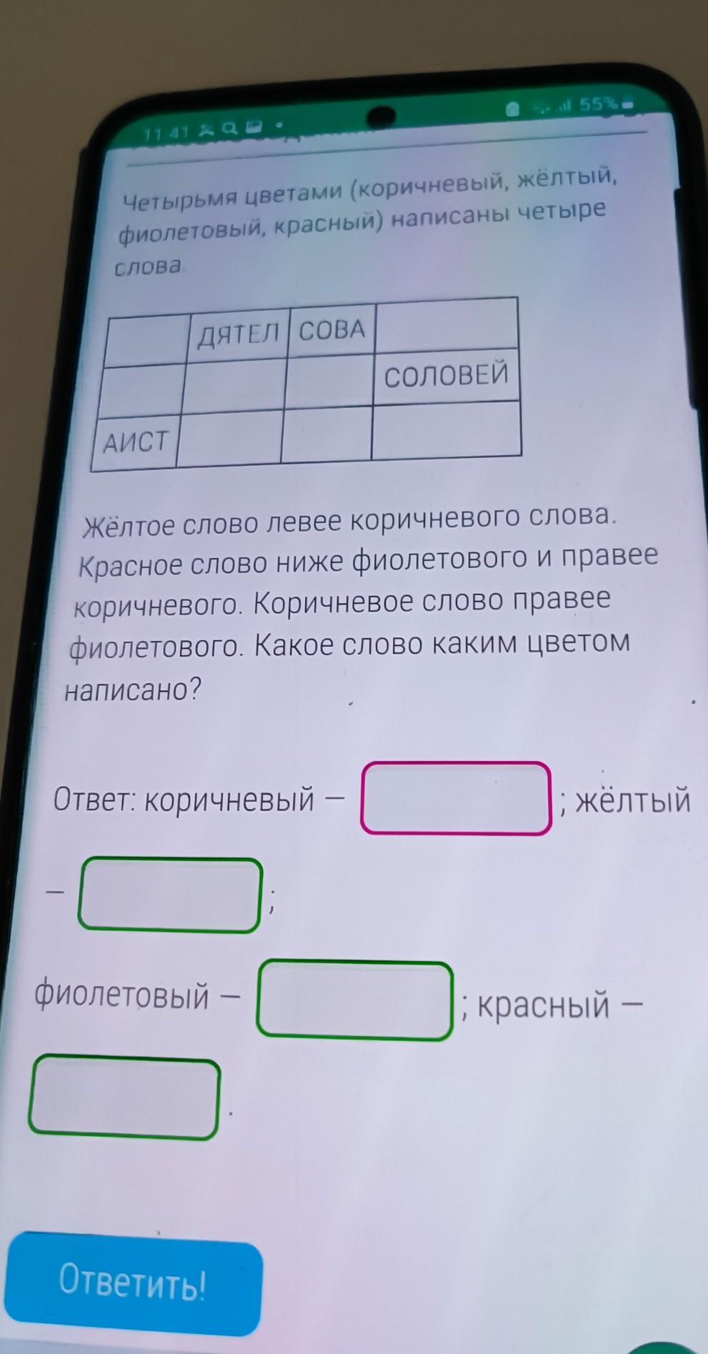 Коричневое слово ПРАВЕЕ фиолетового. Фиолетовое НЕ может быть аистом, значит это у нас дятел. А коричневое — сова, т.к. жёлтый — левее коричневого, так что желтый — аист